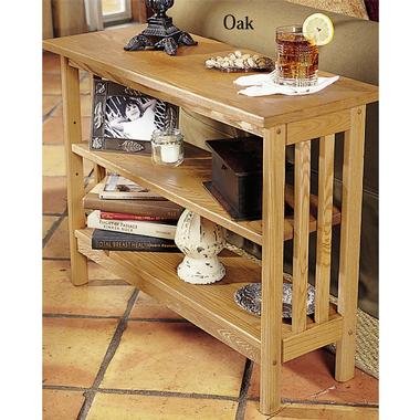 Two shelves provide plenty of storage in this slim table. Organize books and magazines by your chair, and still have room for a cup of coffee and remote control! This table is so slim, you can even place it in front of a window or next to your bed - it won't be in the way. Center shelf adjusts in height. Sturdy Mission design in solid ash with oak finish or chestnut finish. Assembly. 31" L x 12" W x 24" H. Sorry, no air shipment. Bookcase Table Discover Solutions and hundreds of clever, unique "products that make life easier." Everything is backed by the Solutions Lifetime Guarantee: You must be 100% satisfied with your purchase, or we'll gladly replace it or issue a full refund... the choice is yours!