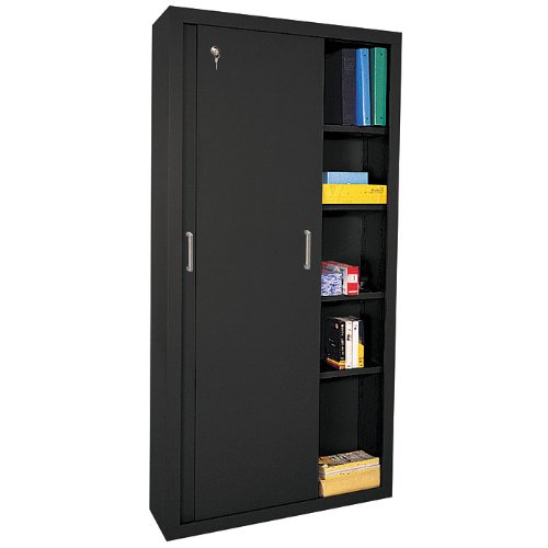 Sandusky 72''H sliding door storage cabinet is constructed of welded steel with a powder coat paint finish.Cabinet features four adjustable shelves, a fixed bottom shelf that is raised off the floor, and a security lock with two keys.Ships fully assembled.